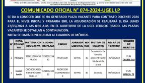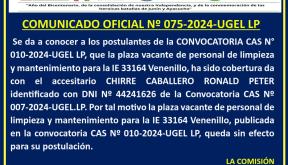 COMUNICADO PLAZA VACANTE PERSONAL DE LIMPIEZA Y MANTENIMEINTO CONV CAS 010-2024-UGEL LP
